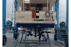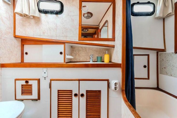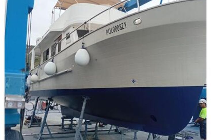 This boat is made of reinforced polyester, with grained sides and the hull above the waterline. The vessel's hull below the waterline was treated with antifouling. Vessel steering is possible from both the lower and upper rudder spaces; the cockpit is well protected, and the rudder space connection is enabled. The vessel's propulsion units are built-in LEHMAN FORD diesel engines with a combined power of 2 x 120 HP.