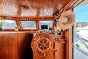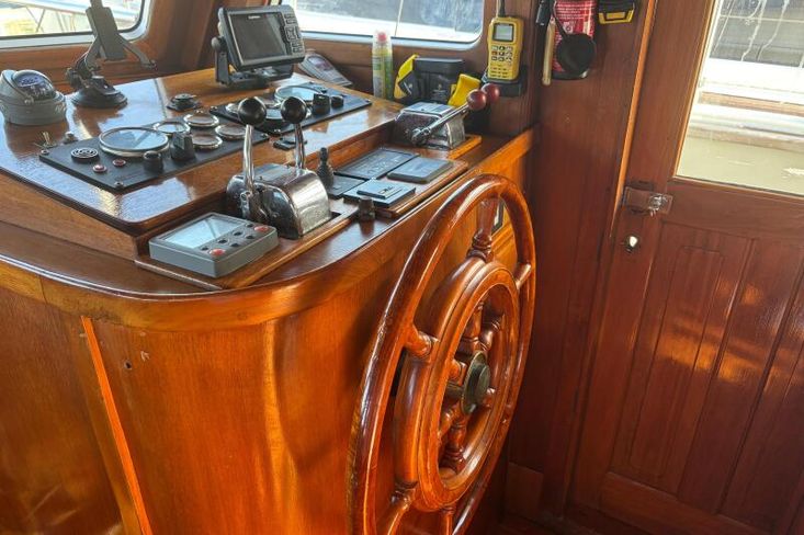 This unit stands out for a major 2015 refit that included a full renovation of the flybridge, a new teak deck, stainless-steel handrails, an upgraded galley, and refreshed interior varnishes. The result is a vessel that combines timeless trawler charm with modern comfort.