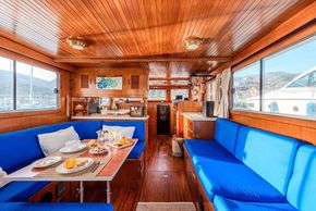 The interior layout includes two spacious double cabins, a large saloon with additional three berths (total 7), a fully equipped galley, and ample storage. Comfort on board is ensured by Webasto heating and air conditioning, an electric WC with holding tank, hot water, and a 6 kW Lombardini generator.